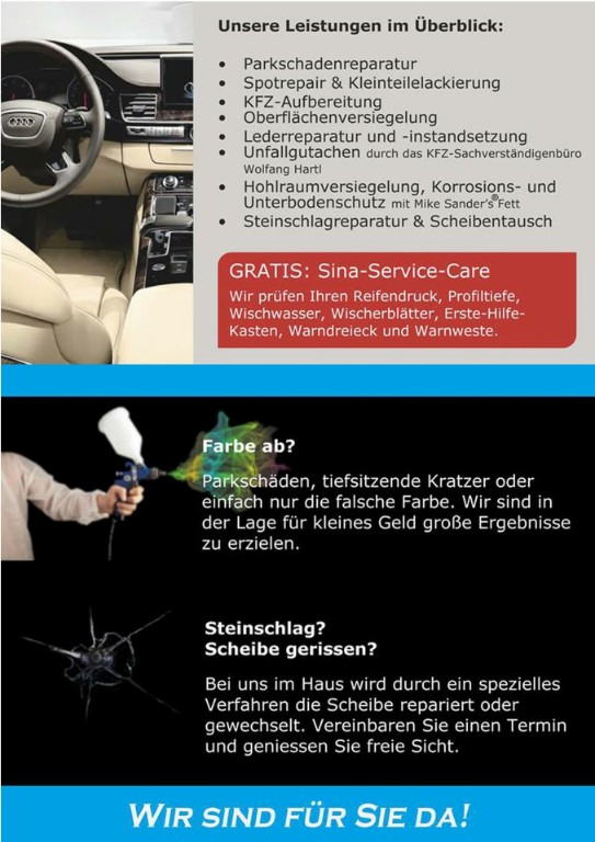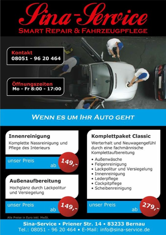 Sina ServiceDer Fahrzeugprofi im Chiemgau.• Kleinschadengarage - Parkschäden - Lackausbesserungen - Kleinlackierungen (Smart-Repair) - Glasscheibentausch &-reparatur - Rostentfernung - Rostprofilaxe• Fahrzeugpflege - Fahrzeugaubereitung innen und außen - Lackkonservierung - OZON- Behandlung - Entschriftung
